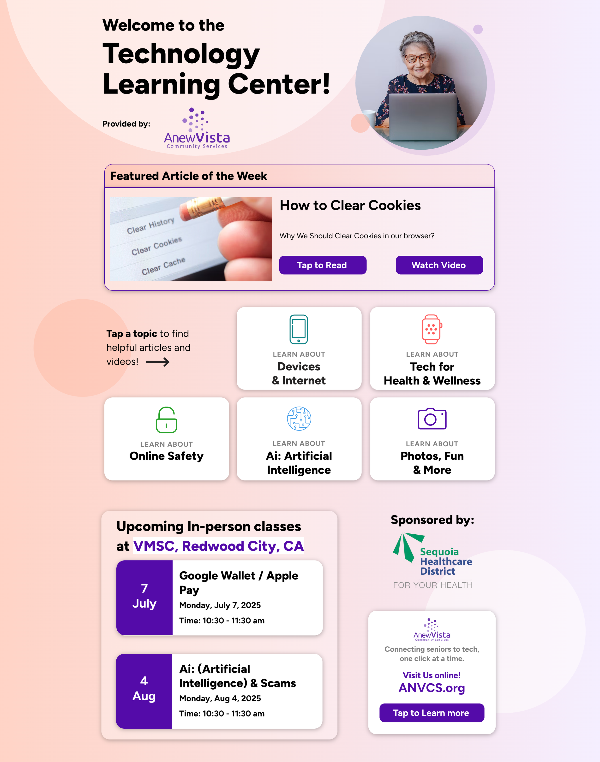 Goal: Enable seniors to browse programs, workshops, and digital resources independently while reducing staff workload.
